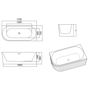 Ванна акриловая Azario LAGO GARDA 1700х750х580 пристенная, рифленая, правосторонняя, в комплекте с сифоном и металлической рамой (AZ-6724-A2 R 17075)